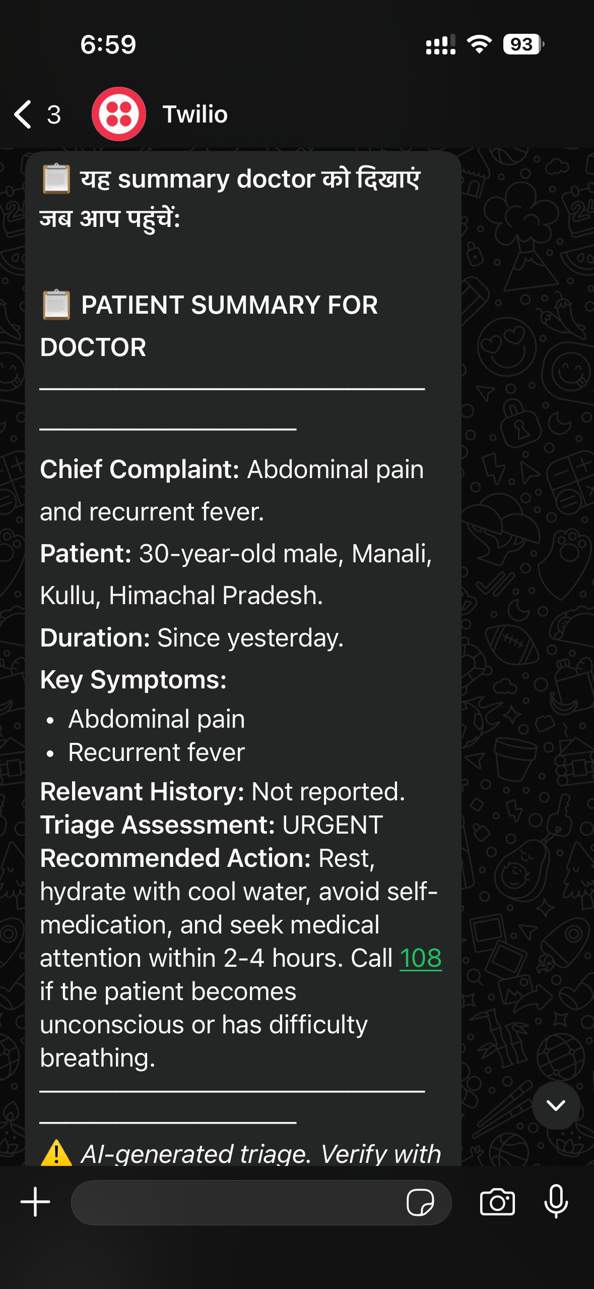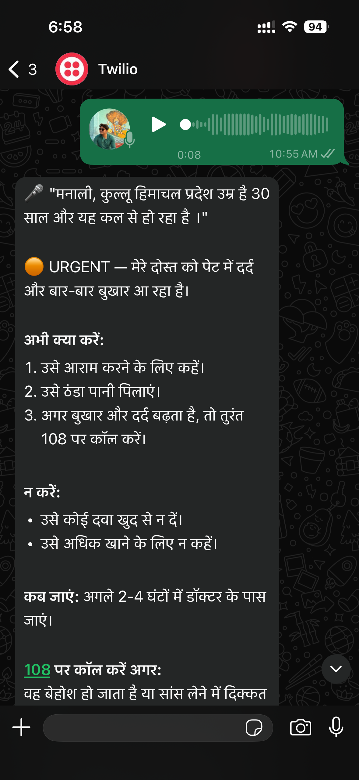 Describe the emergency in any Indian language. Voice note or text. No app, no sign-up — just WhatsApp.