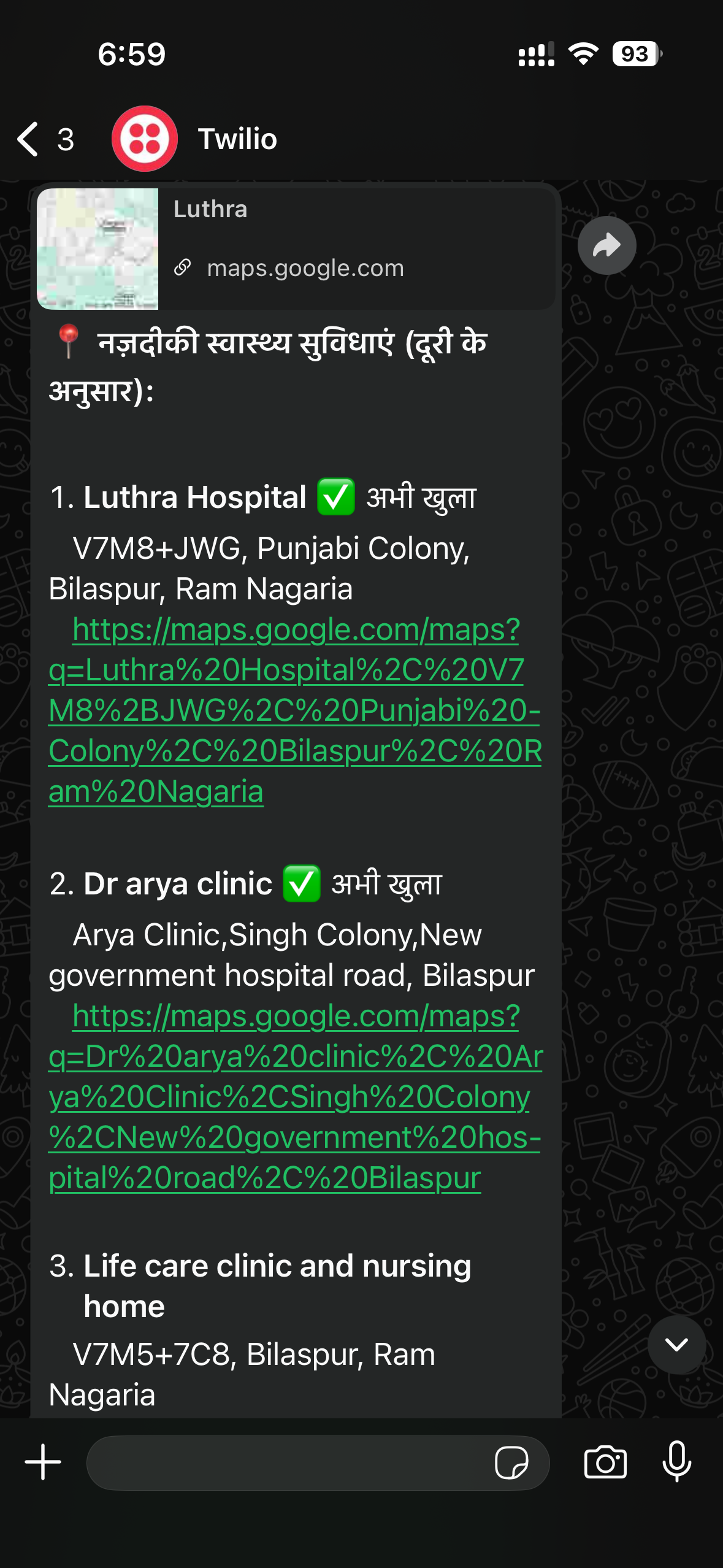 Triage advice + first-aid steps, a doctor-ready clinical summary, and nearby open hospitals with Maps links.